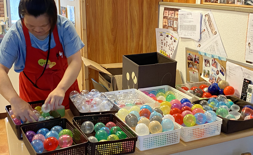 「ガチャガチャ」の丸いケースを清掃・仕分け。毎日コツコツととりくみ、お給料につなげています。